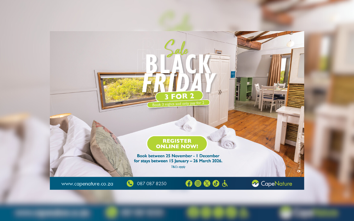 CapeNature is bringing back its popular Black Friday promotion, giving travellers the chance to enjoy a nature escape without stretching their budget. From 25 November to 1 December 2025, visitors who book three consecutive nights at selected CapeNature reserves will only pay for two.
